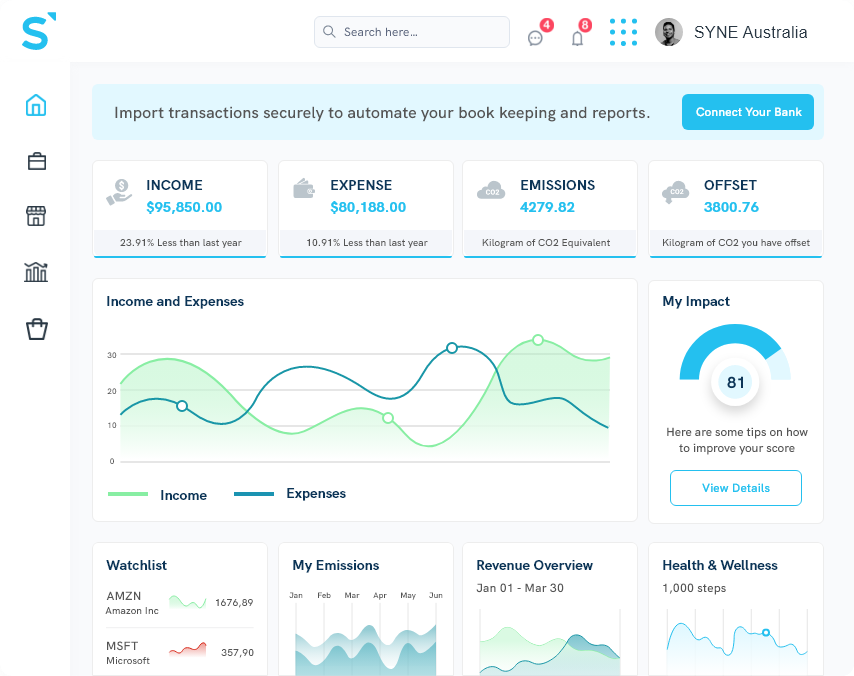 SYNE Unified Platform identifies opportunities for your sustainability value chain using financial behavior and ESG measurements. Our platform connects financial health, environmental, social and governance, supplier management, emissions offset, impact investing and social impact with accountability, responsibility and transparency.